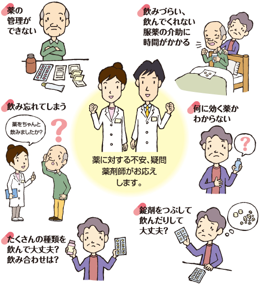 「薬の管理が出来ない」、「飲みづらい・飲んでくれない・服薬の介助に時間がかかる」、「飲み忘れてしまう」、「何に効く薬か分からない」、「たくさんの種類を飲んで大丈夫?飲み合わせは?」、「錠剤をつぶして飲んだりして大丈夫?」などなど、薬に対する不安や疑問を薬剤師がお応えします。