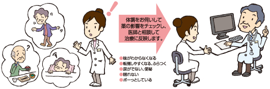 「味が分からなくなる」、「転倒しやすくなる、ふらつく」、「尿が出ない、便秘」、「眠れない」、「ボーッとしている」などの体調をお伺いして薬の影響をチェックし、医師と相談して治癒に反映します。薬も様々な種類があるので、ご本人にあった薬の調整を行います。