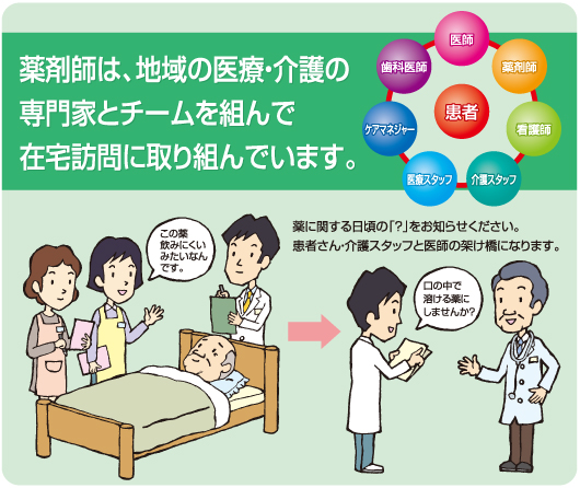 薬剤師は、地域の医療・介護の専門家とチームを組んで在宅訪問に取り組んでいます。